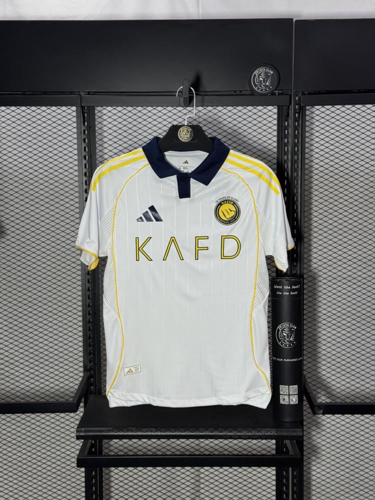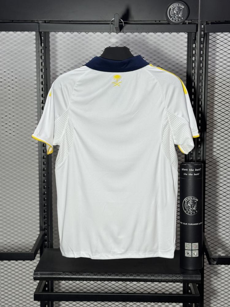 يأتي تيشيرت Al Nassr Away 26/25 بتصميم أنيق يجمع بين اللون الأبيض الأساسي مع لمسات من الذهبي و اللون الأصفر على الصدر، مما يمنحه مظهرا عصريا يعكس فخامة النادي السعودي.